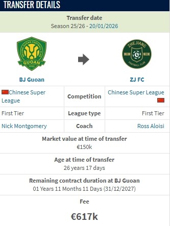 德转更新,方昊从北京国安加盟浙江队的转会费约500万人民币。