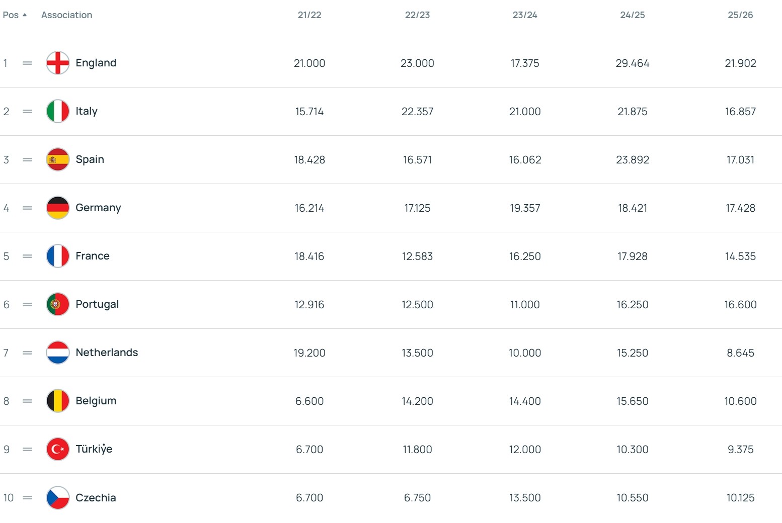 目前的欧战积分中,英格兰21.902分断档领先,德甲、西班牙、意大利和葡萄牙分列2-5位,法国排在第6。