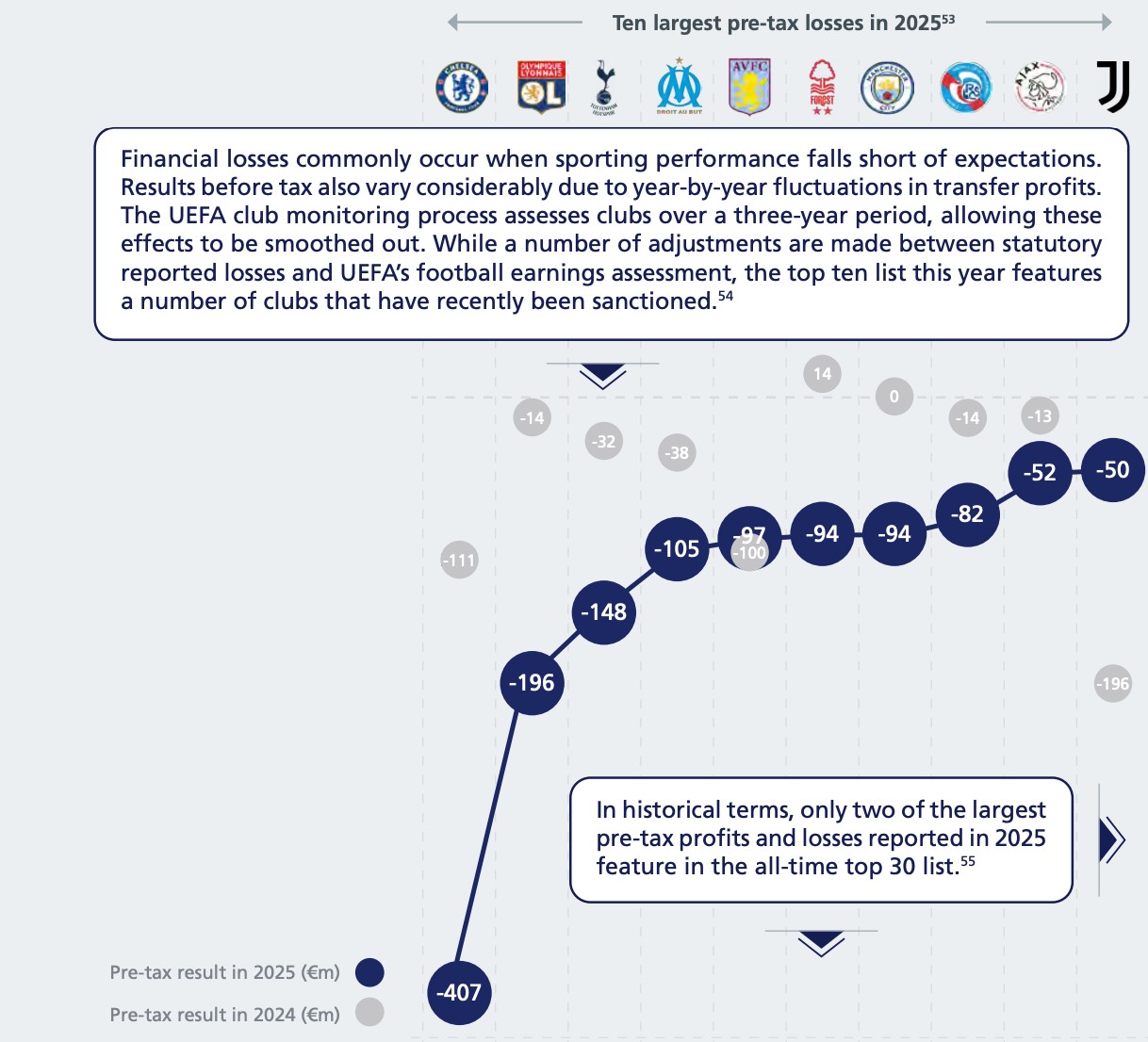 欧足联统计2025年欧洲税前亏损最高的10家俱乐部: