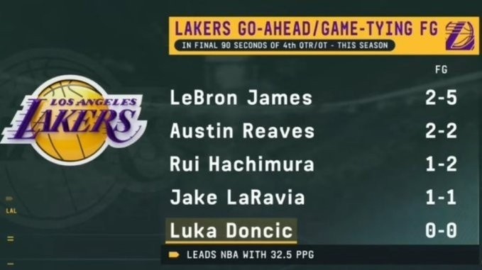据统计,湖人本赛季在第四节最后90秒的扳平或反超球出手: