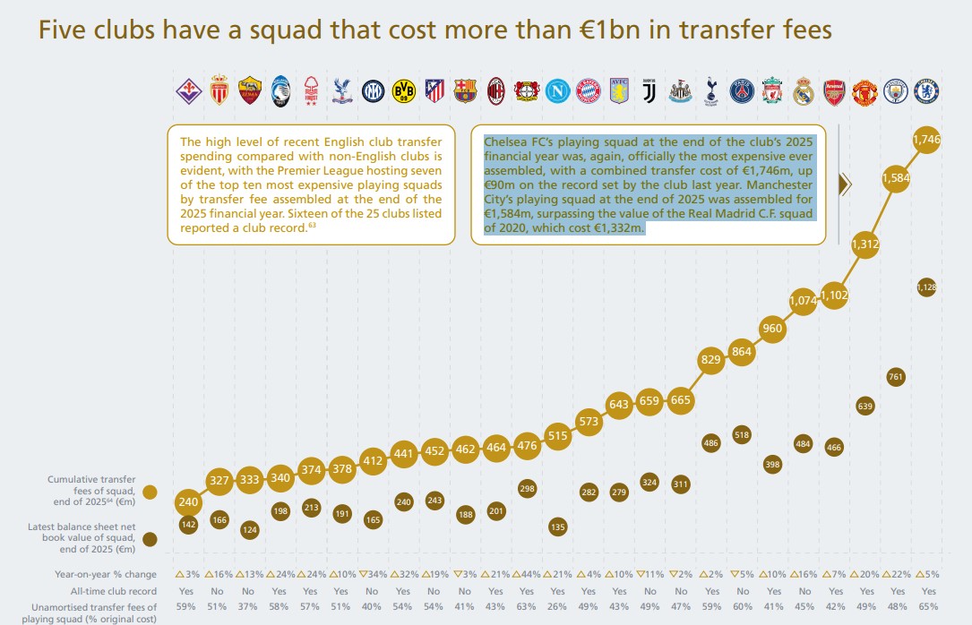切尔西在2025年的球员阵容再次成为有史以来最昂贵的,总转会费用达到了17.46亿欧元,比去年创下的纪录增加了9000万欧元。