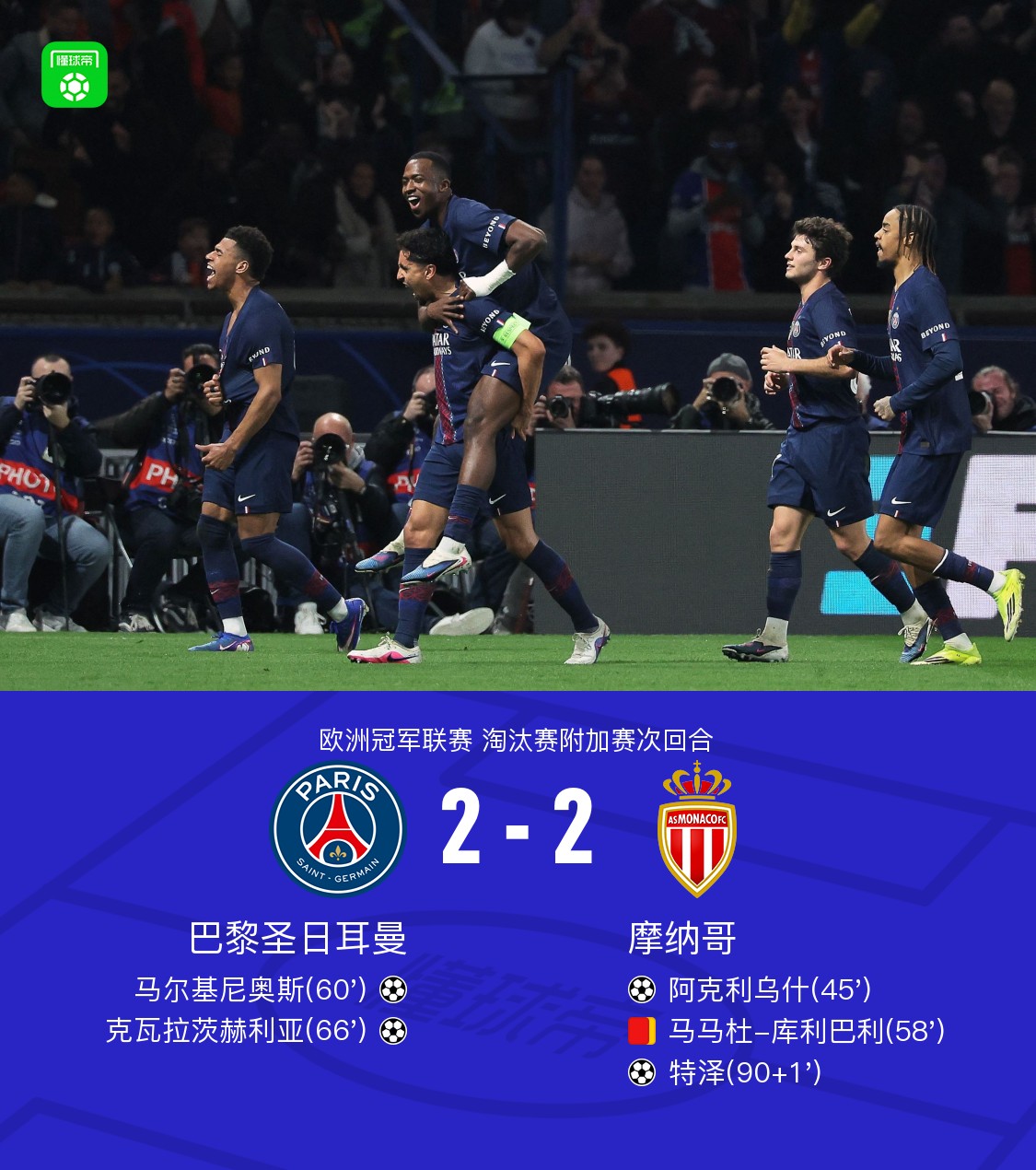 北京时间2月26日欧洲冠军联赛 淘汰赛附加赛次回合,巴黎圣日耳曼对阵摩纳哥。巴黎圣日耳曼马尔基尼奥斯破门,克瓦拉茨赫利亚破门。摩纳哥阿克利乌什破门,特泽破门。最终比分巴黎圣日耳曼 22 摩纳哥。两回合总比分巴黎圣日耳曼5-4摩纳哥。