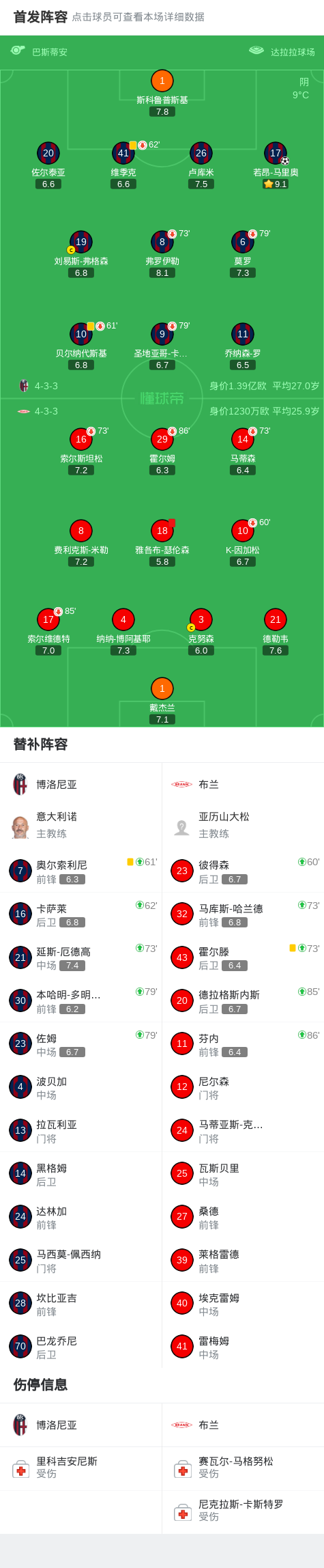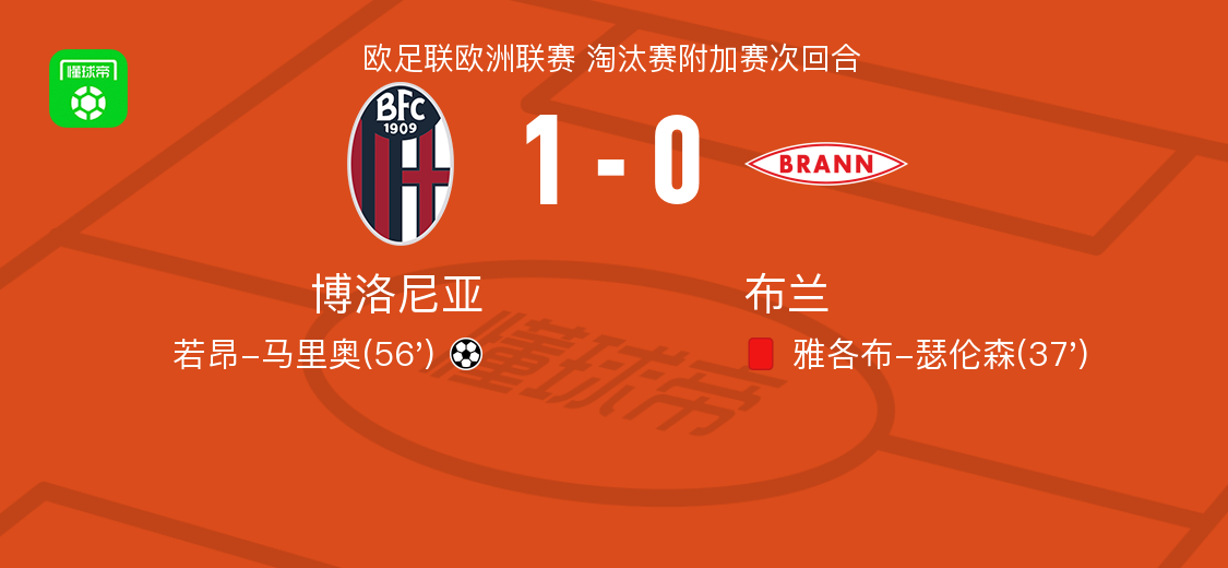 北京时间2月27日欧足联欧洲联赛 淘汰赛附加赛次回合,博洛尼亚对阵布兰。博洛尼亚若昂-马里奥破门。最终比分博洛尼亚 1–0 布兰。两回合总比分博洛尼亚2-0布兰。