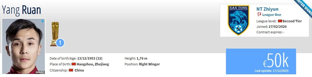 北京时间2月27日,德转更新,原天津津门虎前锋阮杨重返南通支云。