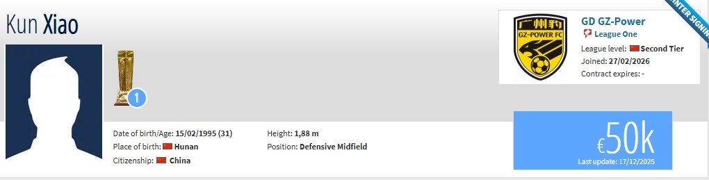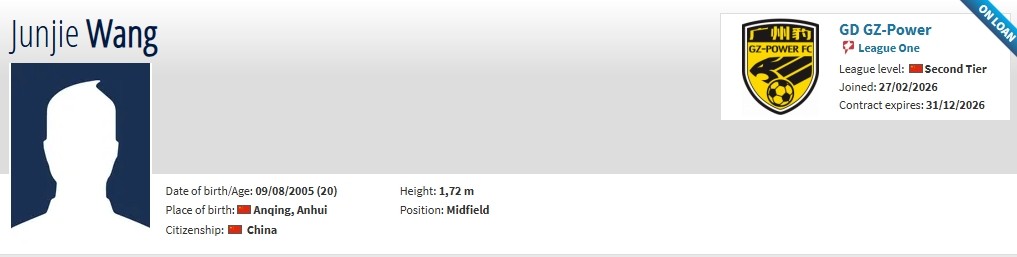北京时间2月27日,德转更新,广东广州豹签下原青岛海牛中场肖鲲,租借浙江队中场王俊杰。