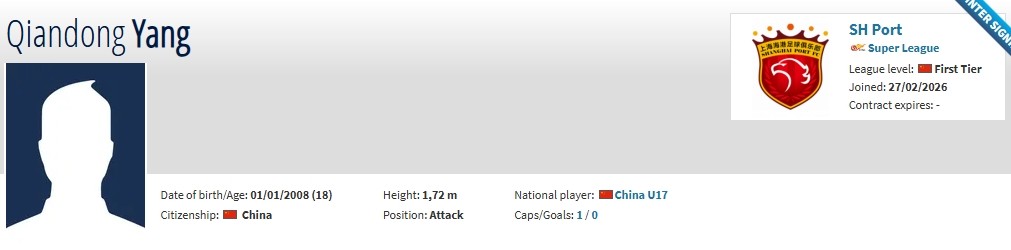 北京时间2月27日,德转更新,18岁前锋杨黔东自由身加盟上海海港。此前他与恒大足校陷入合同纠纷。