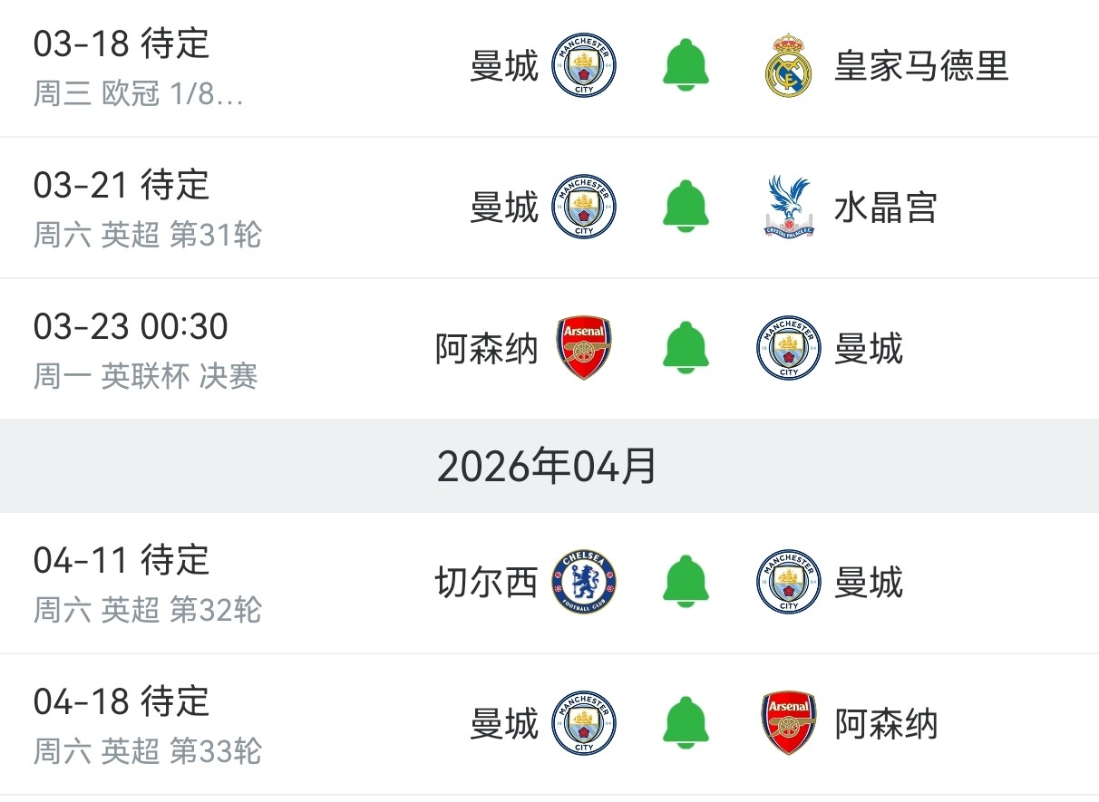 另外,曼城还将迎来魔鬼赛程,3月下旬开始,他们要先迎来主场对阵皇马的次回合比赛,接着参加对阵阿森纳的英联杯决赛,国际比赛日后,他们将在客场迎战切尔西,又在主场迎战阿森纳。