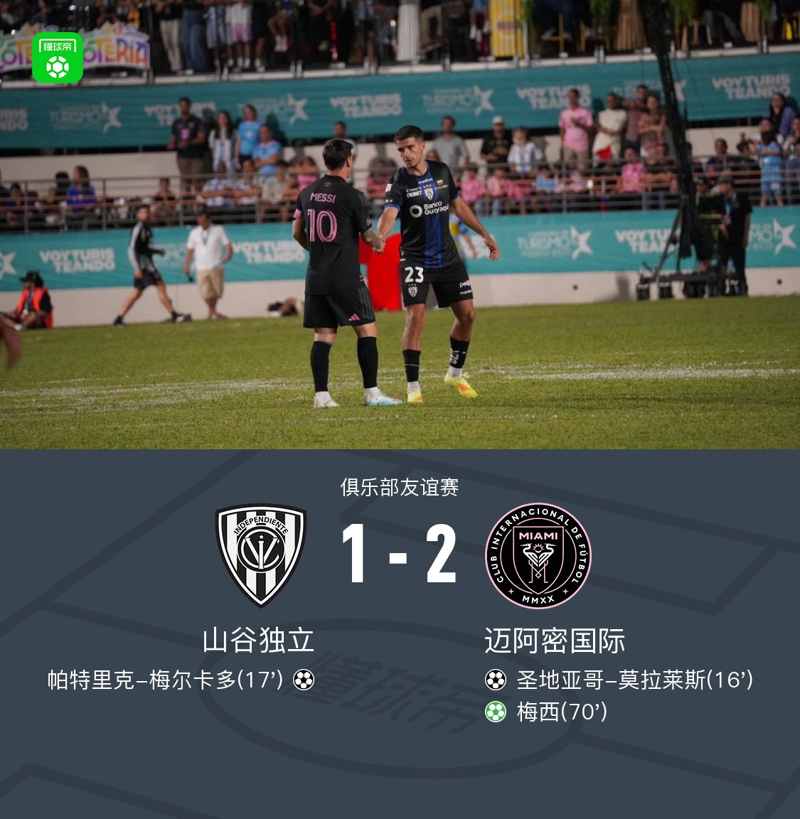 北京时间2月27日俱乐部友谊赛,山谷独立对阵迈阿密国际。山谷独立队梅尔卡多破门。迈阿密国际队苏亚雷斯助攻+造点,圣地亚哥-莫拉莱斯破门,梅西点射。最终比分迈阿密国际2-1山谷独立。