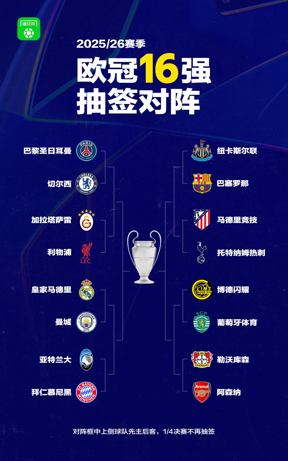 2025/2026赛季欧冠淘汰赛抽签结果出炉,1/8决赛中,皇马将对阵曼城,巴黎将对阵切尔西,巴萨将对阵纽卡。