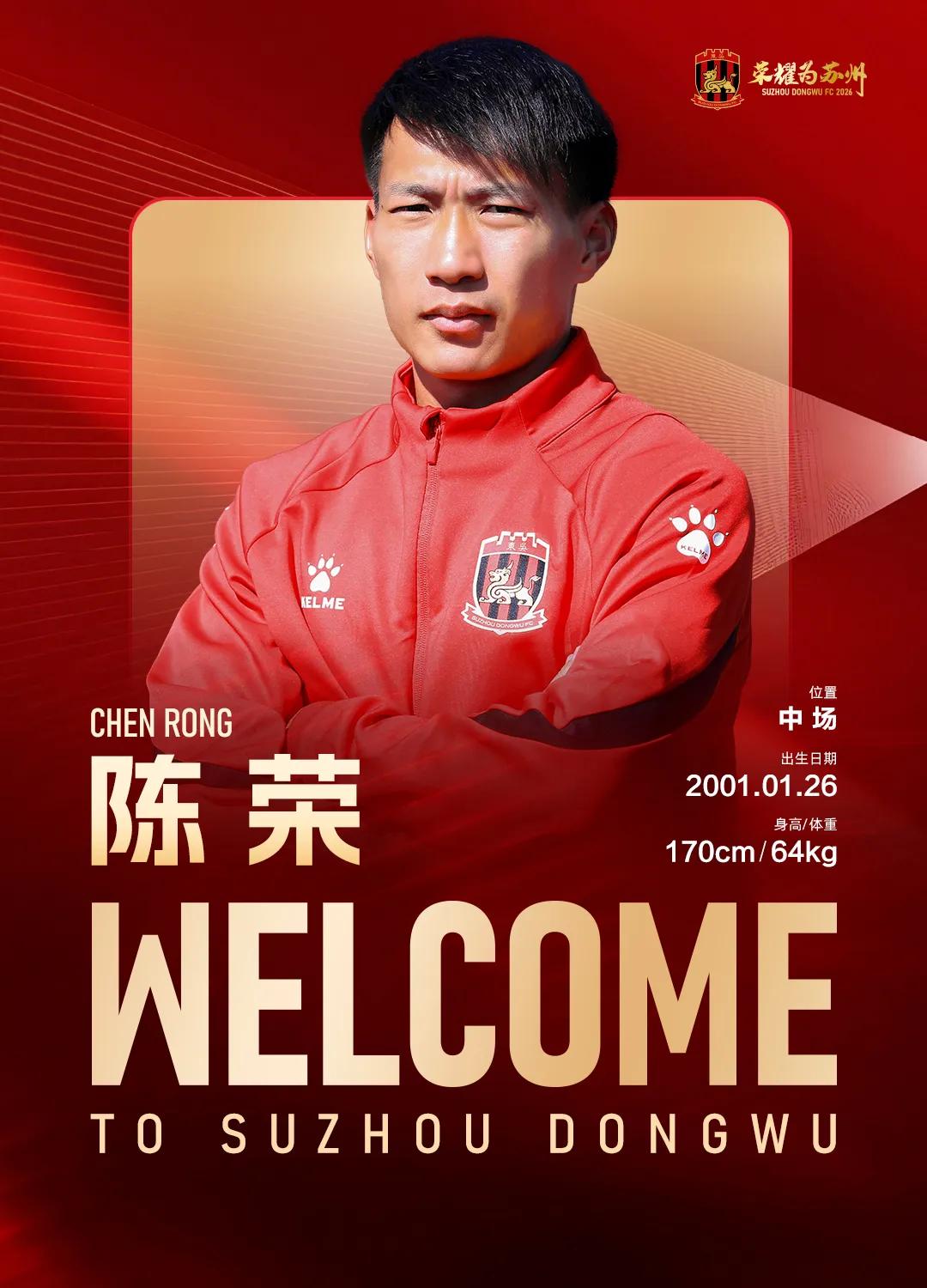 陈荣,2001年1月26日出生,身高170cm,体重64kg,安徽六安人,司职中场。