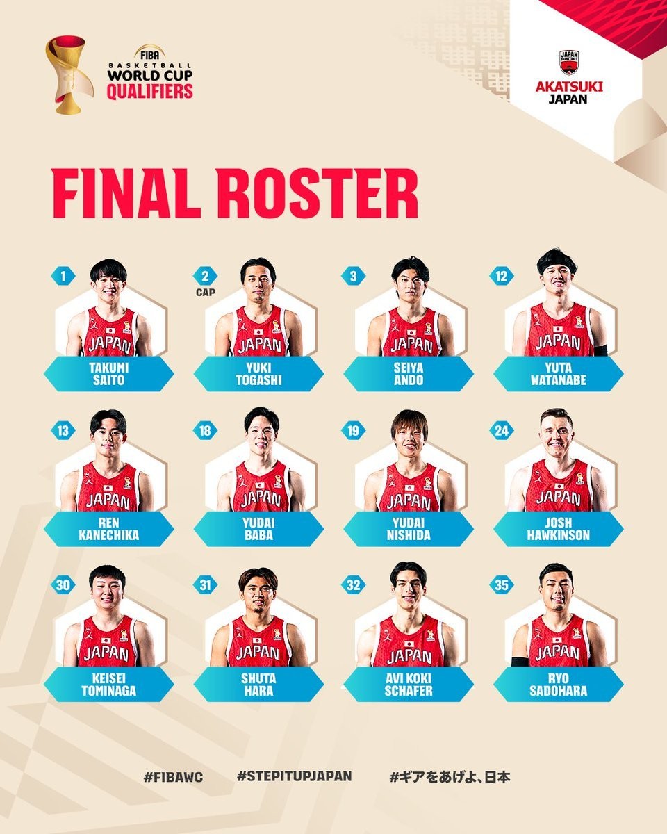 北京时间2月28日,男篮世预赛第二窗口期,日本男篮对阵韩国男篮赛前,日本男篮公布了本场比赛的参赛人员名单,霍金森回归替换科克,佐土原辽替换渡边飞勇。