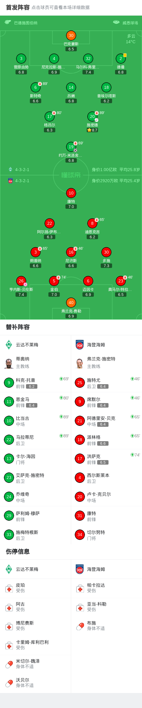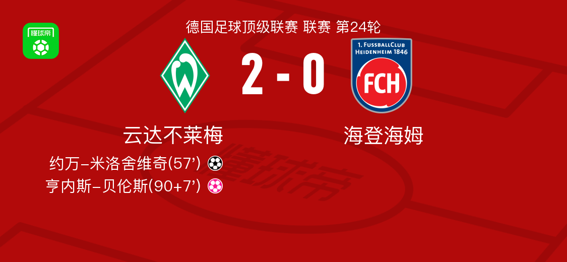 北京时间2月28日德国足球顶级联赛 联赛 第24轮,云达不莱梅主场对阵海登海姆。云达不莱梅约万-米洛舍维奇破门。海登海姆亨内斯-贝伦斯自摆乌龙。最终比分云达不莱梅 2–0 海登海姆。