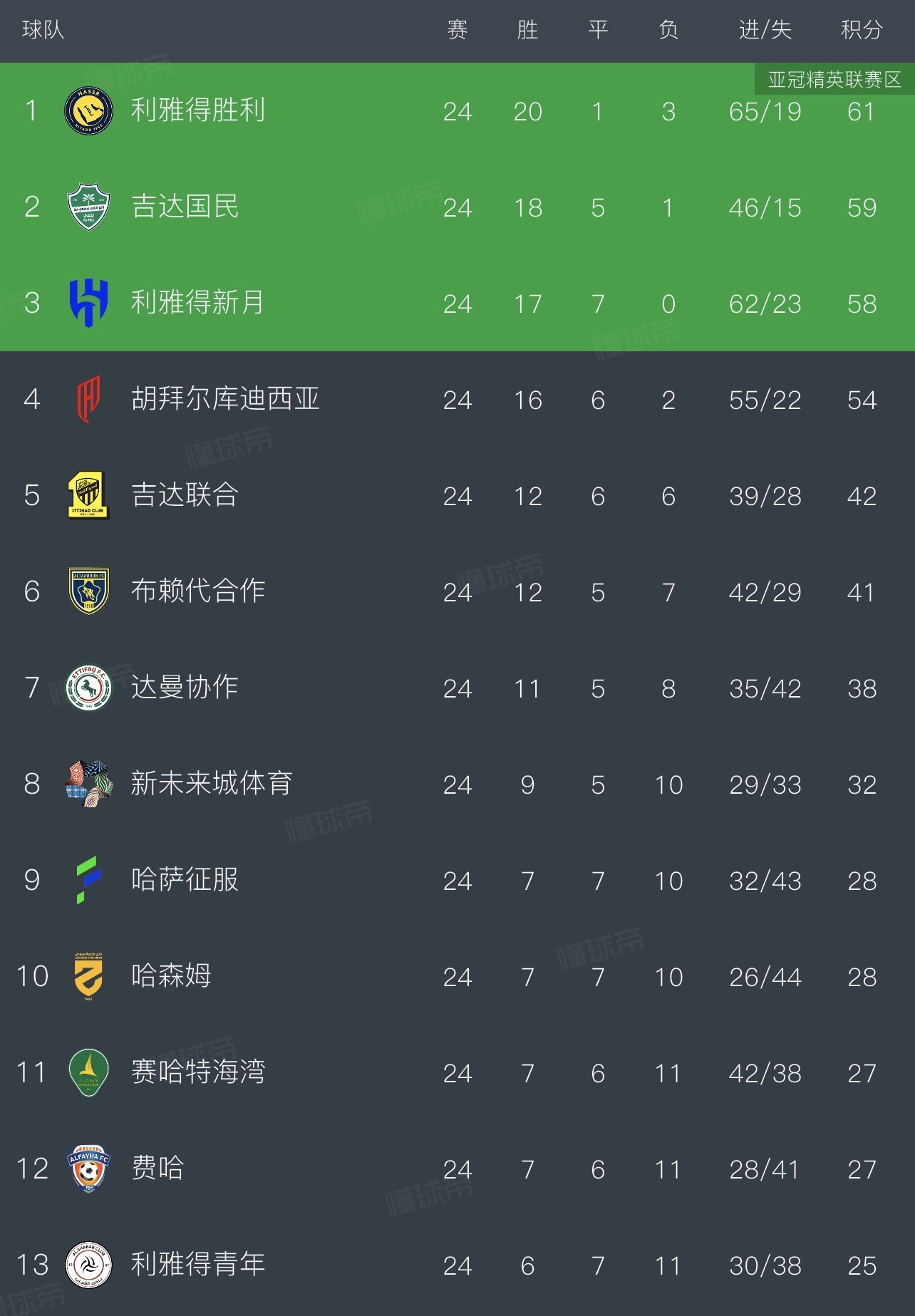 1.利雅得胜利 胜20平1负3 61分