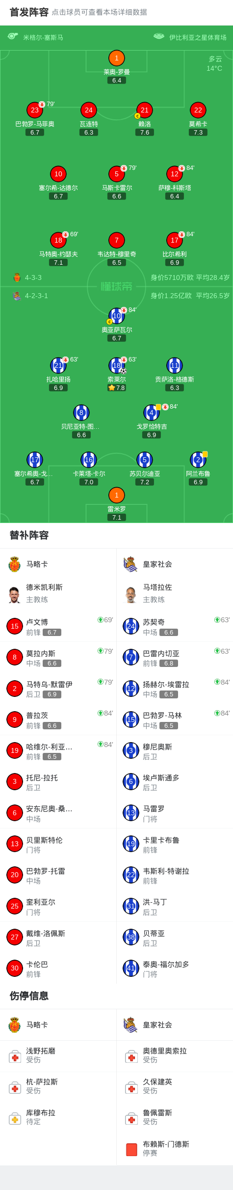 北京时间3月1日西班牙足球甲级联赛 联赛 第26轮,马略卡主场对阵皇家社会。皇家社会索莱尔破门。最终比分马略卡 0–1 皇家社会。 点击查看本场比赛详细数据>> 点击查看西甲完整积分榜>> 精彩瞬间 第36分钟,皇家社会球员索莱尔打入一球。 球队阵容 技术统计 文章导航 仅用了24场,凯恩是本赛季五大联赛首位打入30球的球员 时隔281天再度在联赛进球,为卢卡库五大联赛生涯最长间隔