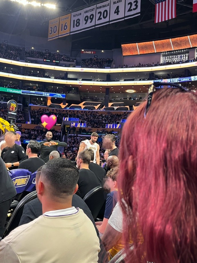 而詹姆斯或许也是发现了她在观众席的靓丽身影,向她比了个心。