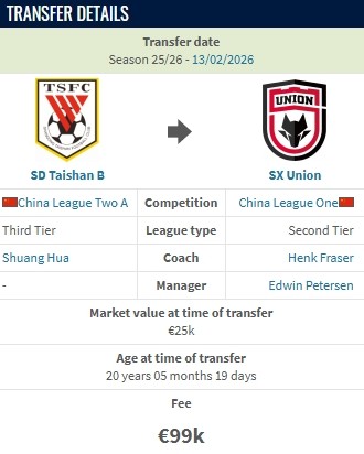 德转显示,陕西联合签下山东泰山B队后卫孟繁宁的转会费约80万人民币。