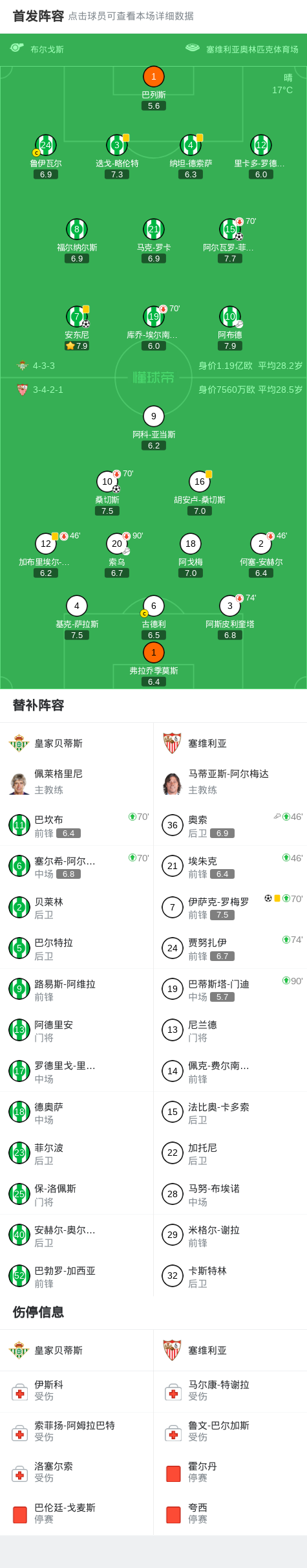 北京时间3月2日西班牙足球甲级联赛 联赛 第26轮,皇家贝蒂斯主场对阵塞维利亚。皇家贝蒂斯安东尼破门,阿尔瓦罗-菲达尔戈破门。塞维利亚桑切斯破门,伊萨克-罗梅罗破门。最终比分皇家贝蒂斯 2–2 塞维利亚。