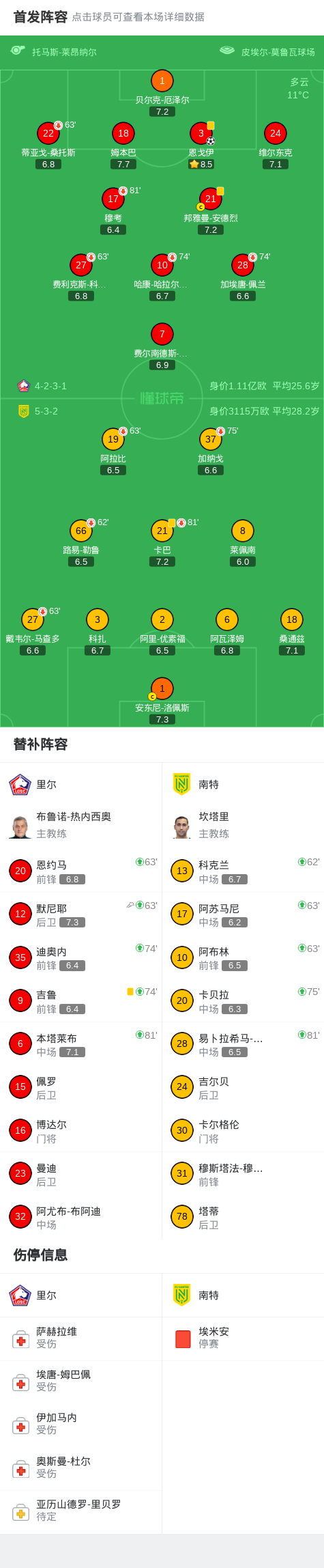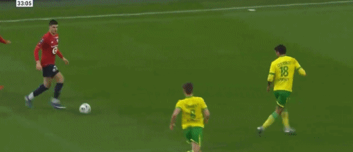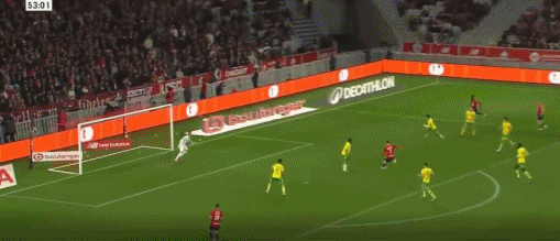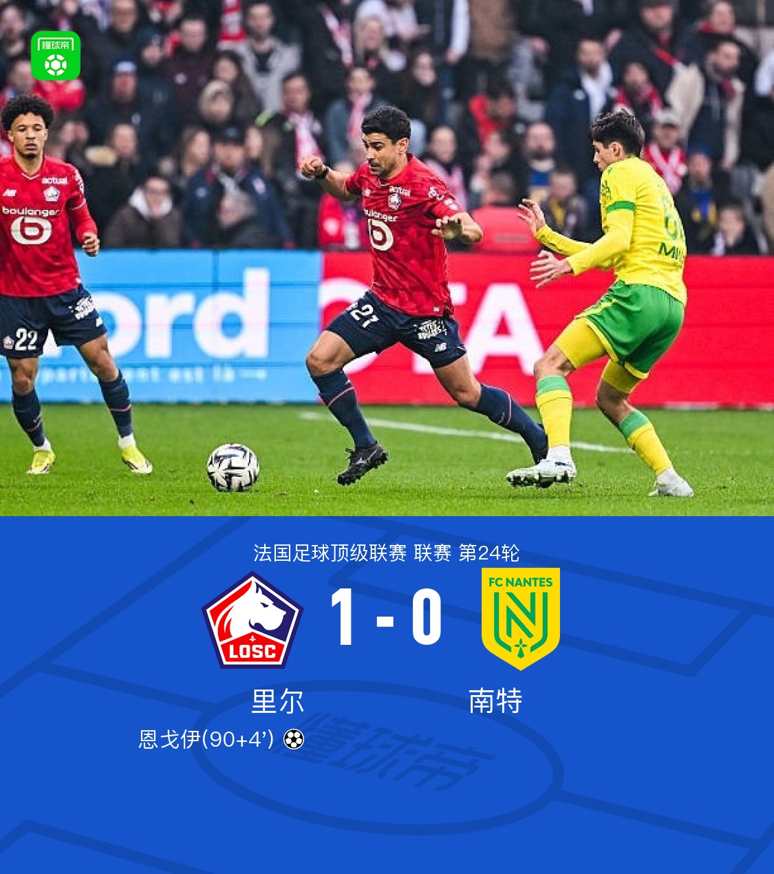 第90+4分钟,默尼耶将球回做,恩戈伊补时破门,里尔1-0南特