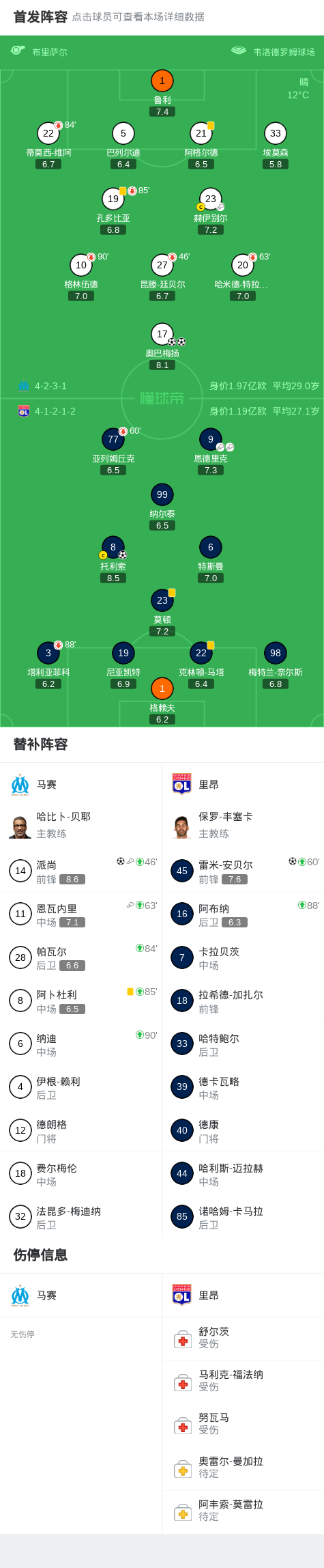 北京时间3月2日法国足球顶级联赛 联赛 第24轮,马赛主场对阵里昂。马赛派尚破门,奥巴梅扬梅开二度。里昂托利索破门,雷米-安贝尔破门。最终比分马赛 32 里昂。