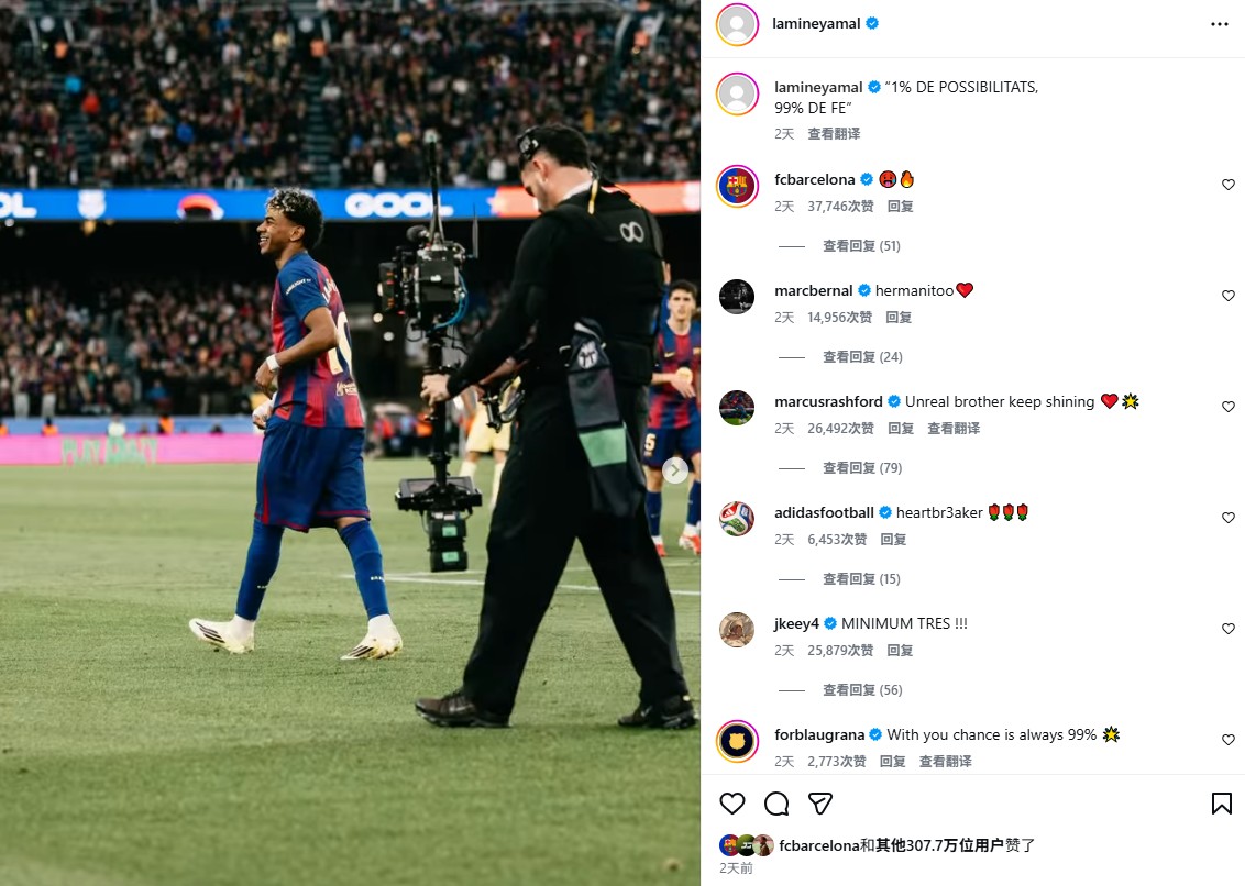 亚马尔也复制了这一信息,并用加泰罗尼亚语发布:“1% de possibilitats, 99% de fe”(1%的可能性,99%的信念)。