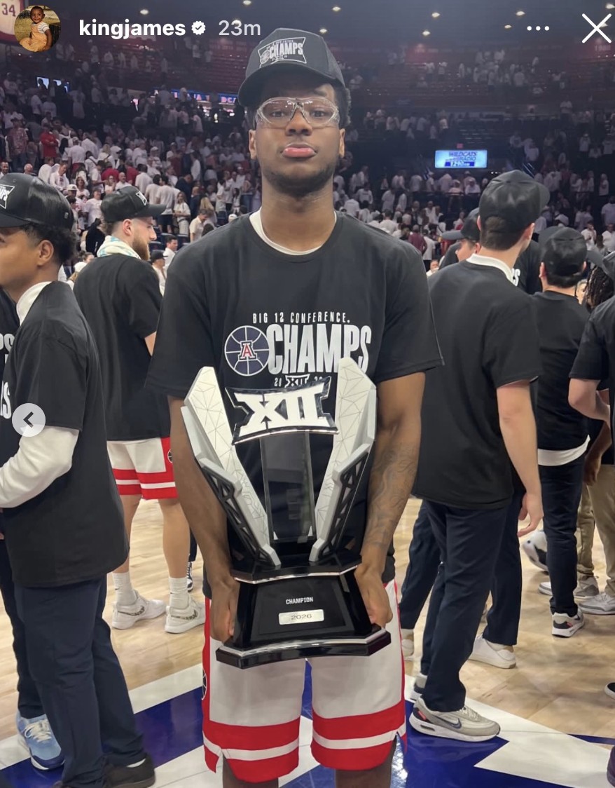 近日,詹姆斯二儿子所在的亚利桑那大学野猫队以73-57大胜爱荷华州立大学,成功夺得2026年Big 12联赛常规赛冠军。
