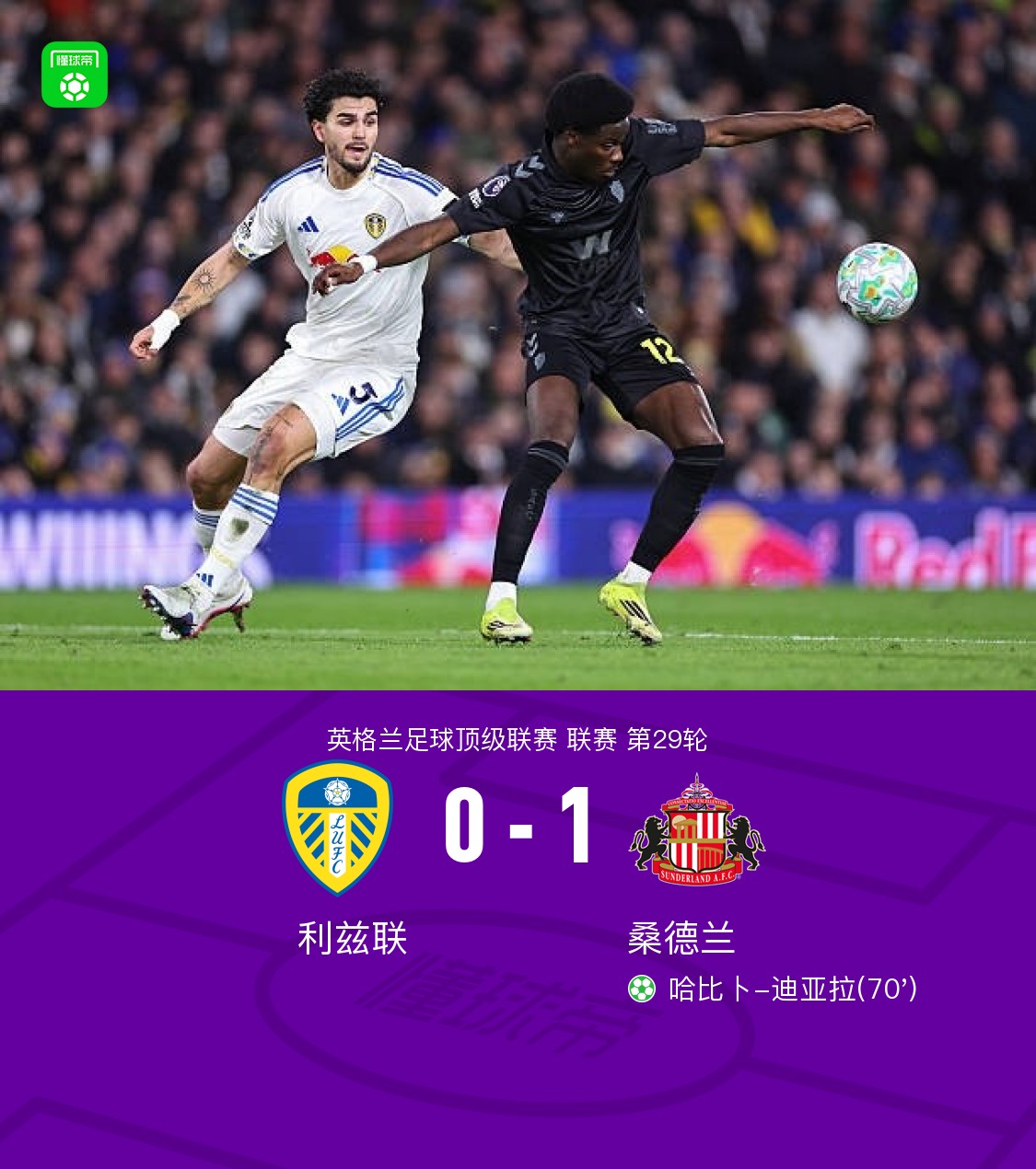 第69分钟,阿姆帕杜手球送点,迪亚拉主罚命中,利兹联0-1桑德兰