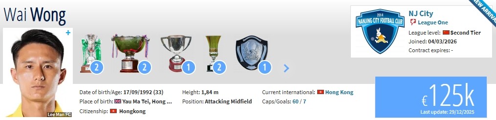 黄威现年33岁,来自中国香港,司职中场。此前球员效力于港超理文,期间共出场80次,打进13球助攻14次。此前理文已官宣球员离队。