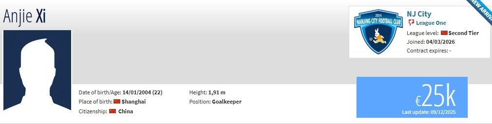 奚安杰现年22岁,司职门将,在2025赛季夏窗从上海海港租借加盟南京城市,目前共出场2次,此次为正式加盟。德转显示转会费为2.5万欧元,约20万人民币。