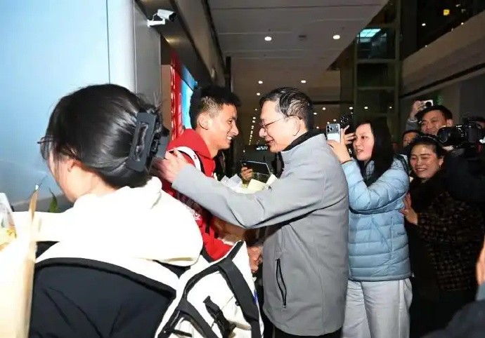刚下飞机的丰配友一身运动装,面对前来迎接的领导与亲友,难掩激动之情:“特别感谢省体育局领导和家人们专程来接机,我感到既惊喜又荣幸。这份关心和认可,是我继续前行的最大动力。”