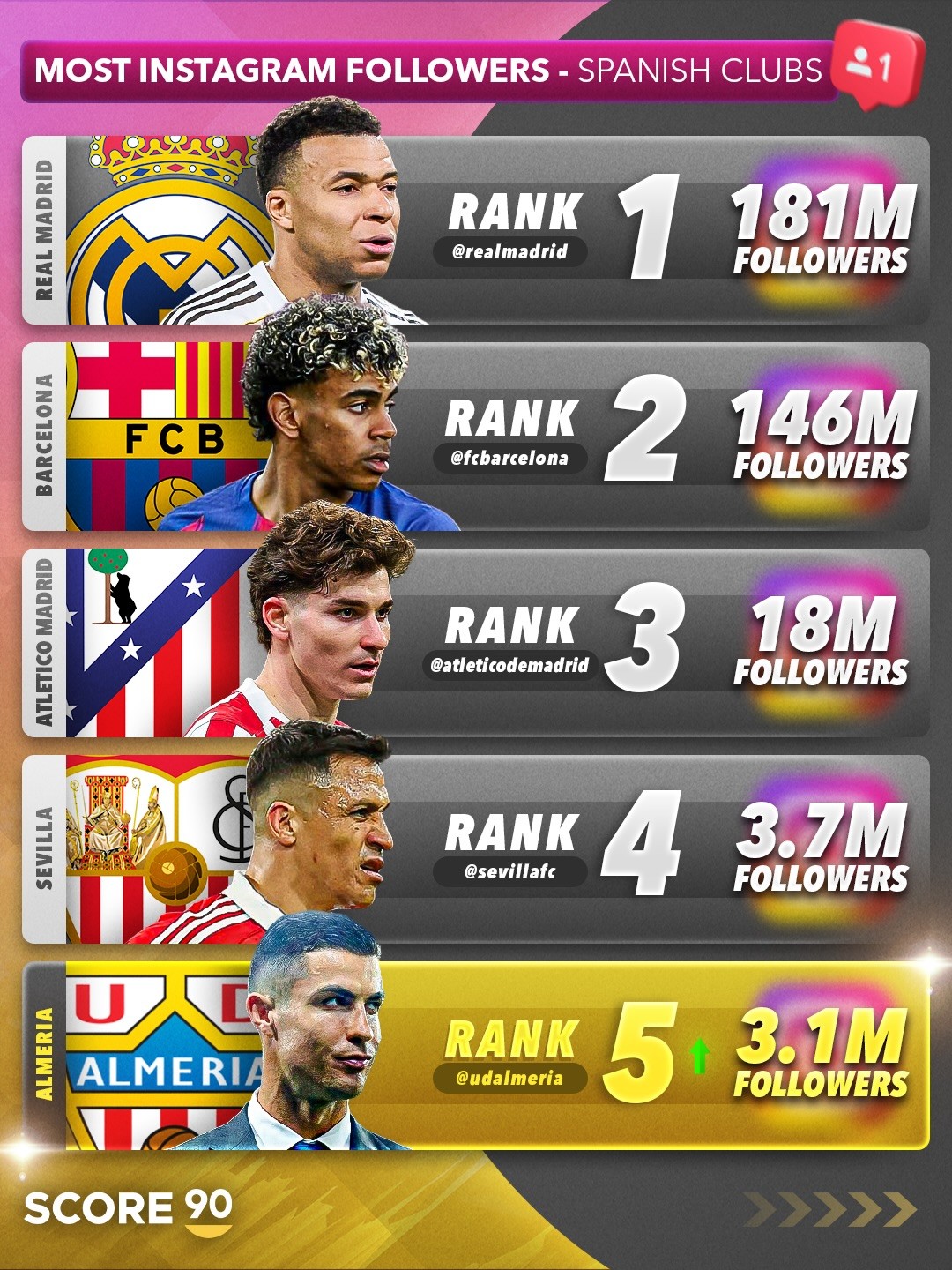 在C罗完成对阿尔梅里亚俱乐部的部分股权收购后,阿尔梅里亚俱乐部的官方社交媒体账号粉丝数量飙升,截至目前,阿尔梅里亚的社媒账号粉丝量达到了310万,成为粉丝数量第五多的西班牙足球俱乐部。