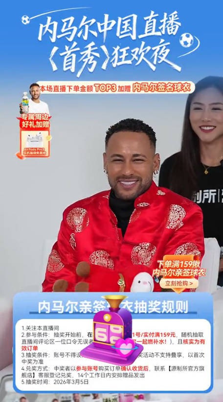 不过在直播还没到一个小时,内马尔就离开了直播间,目前他抖音账号的直播仍在进行中,只剩下主持人在进行带货。