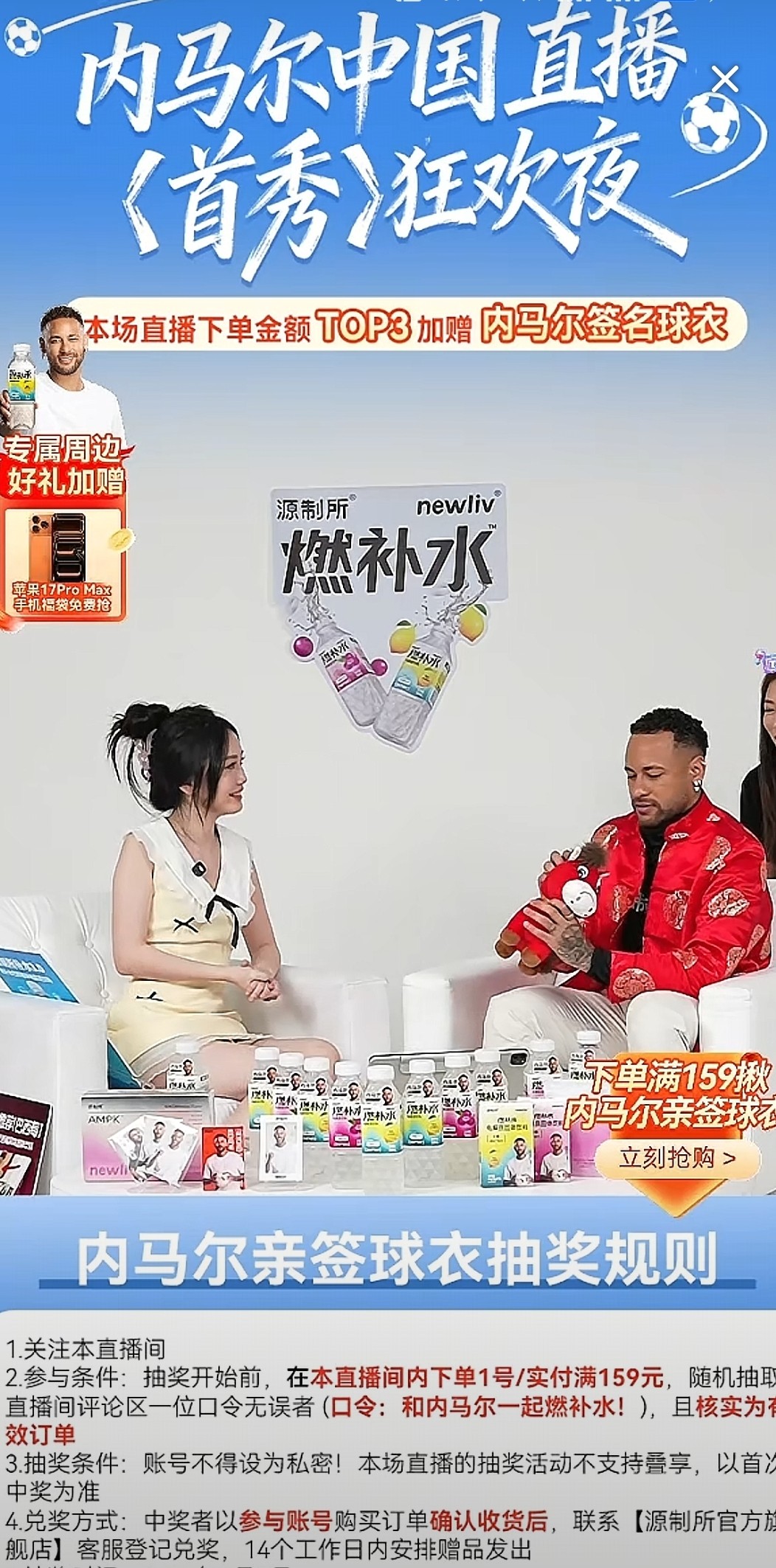 21:30,内马尔在自己的抖音账号中开启直播,他为国内的一家运动饮料品牌带货,可以看到,直播间有高达3万名观众观看直播,在互动中,他获得了主持人赠送的马玩偶。