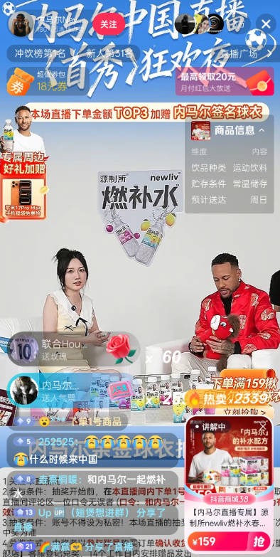 北京时间3月5日21:30,内马尔在抖音平台参与了直播,为某运动饮料品牌带货。