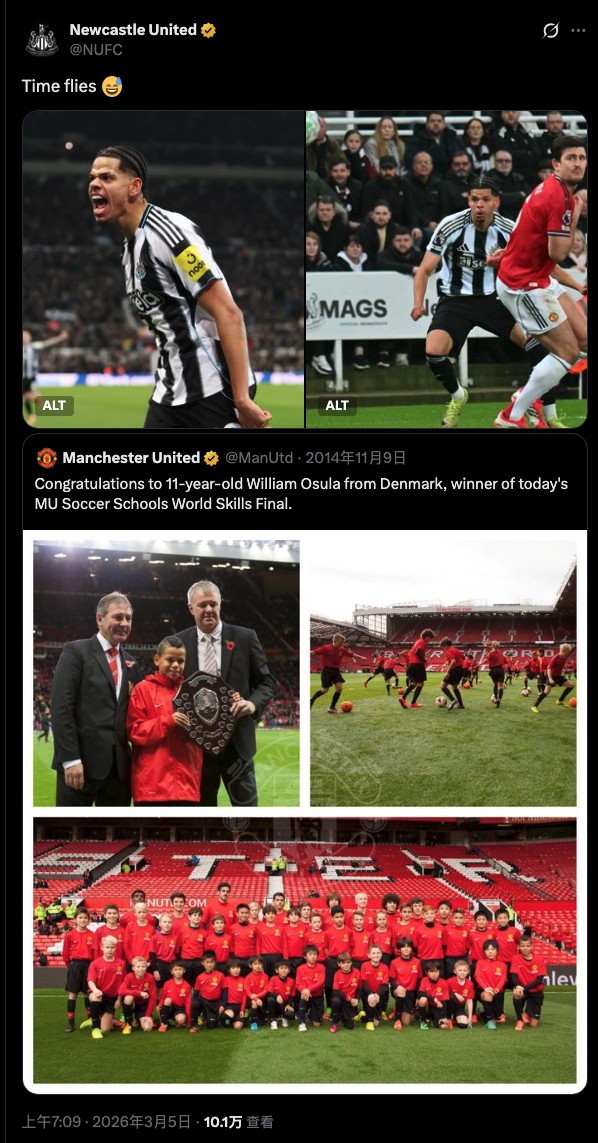 赛后,纽卡官方转发了曼联当年的帖子,并配文:“时光飞逝😅”