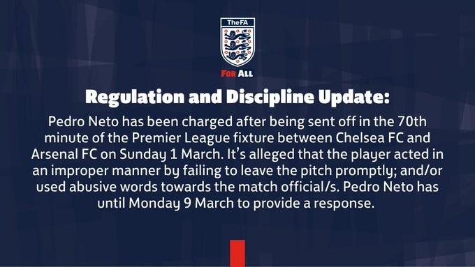 在3月1日进行的英超联赛切尔西对阵阿森纳的比赛中,佩德罗-内托在第70分钟被罚下场,据称,球员被指控未能及时离场,行为不当,并且对比赛官员使用了辱骂性语言,他需在3月9日之前作出回应。