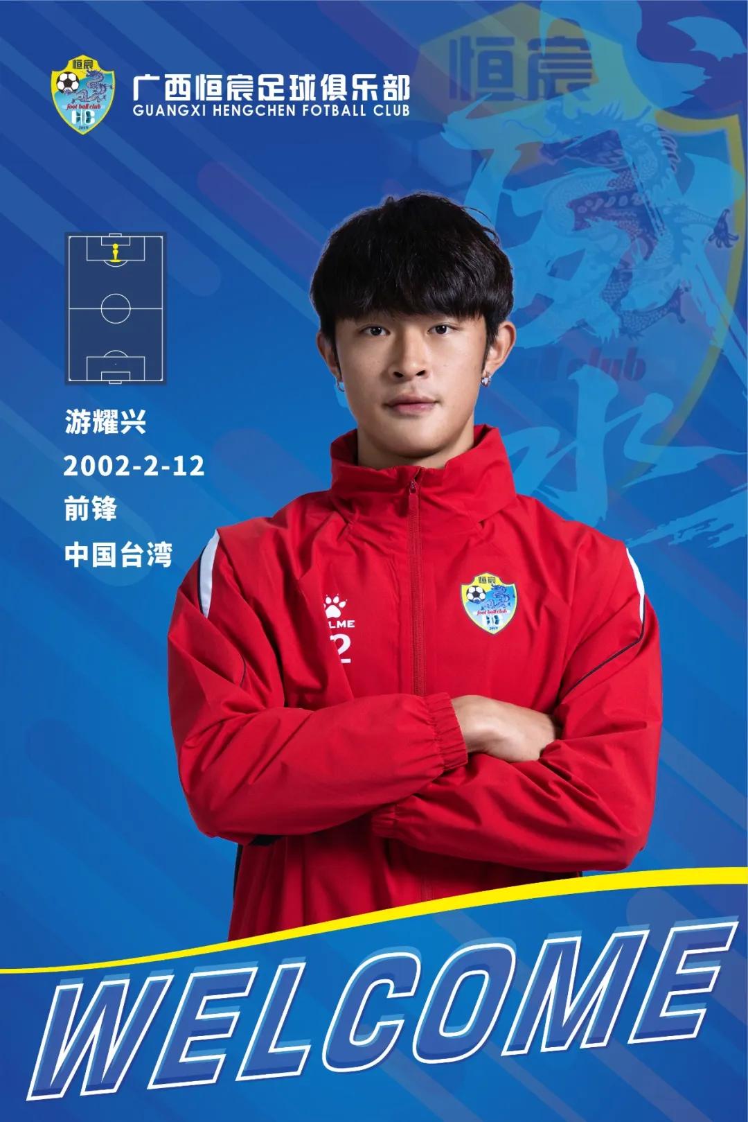 经俱乐部与球员本人协商一致,中国台湾前锋游耀兴(Yao-Hsing Yu)正式加盟广西恒宸,成为俱乐部队史首位港澳台球员。未来游耀兴将代表广西恒宸征战各项赛事,期待他为广西足球带来更多荣誉!