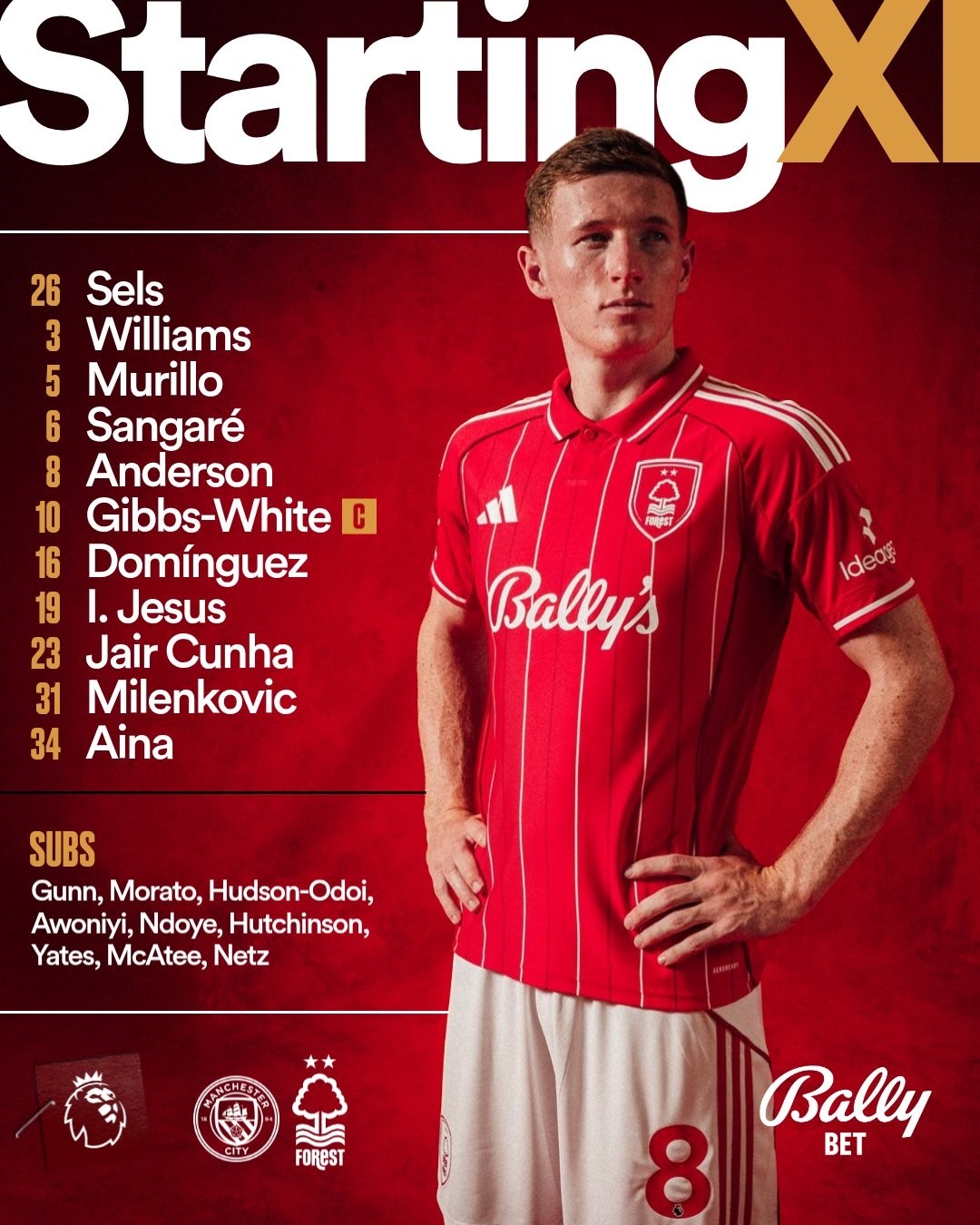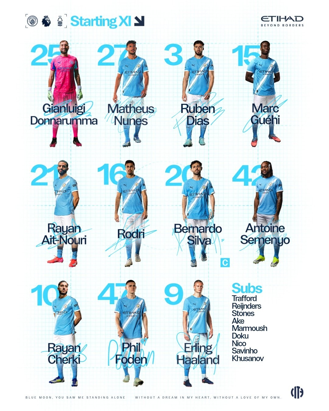 曼城首发:25-多纳鲁马、27-努内斯、3-鲁本-迪亚斯、15-格伊、21-努里、16-罗德里、20-B席、47-福登、10-谢尔基、42-塞门约、9-哈兰德