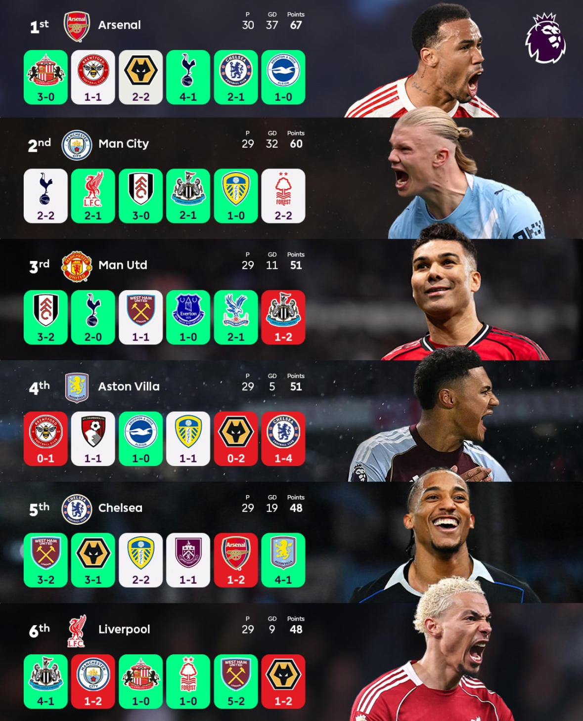 英超前六名球队最近6轮联赛的战绩情况: