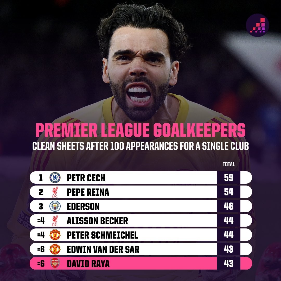 英超第29轮,阿森纳客场1-0击败布莱顿,至此,戴维-拉亚阿森纳生涯100场英超收获了43次零封,为英超历史上代表单一俱乐部前100场零封场次第六多。