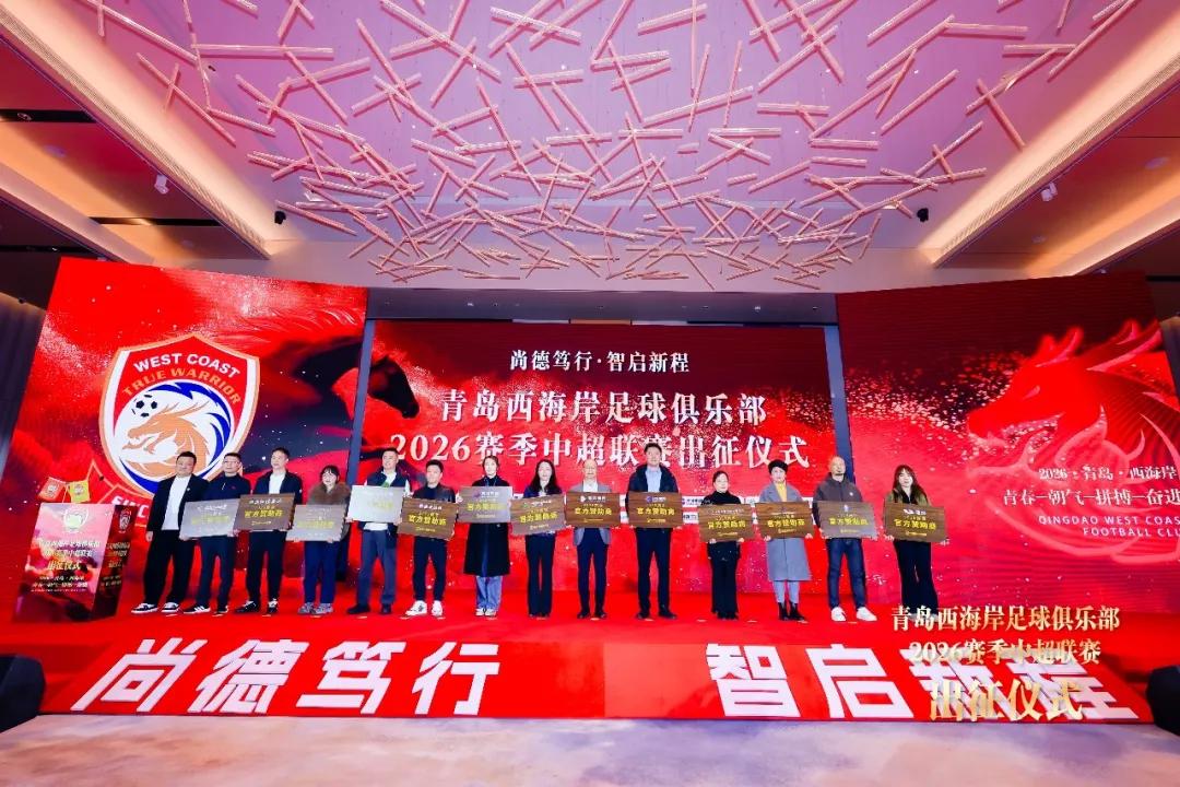 尚德笃行,智启新程。3月4日,青岛西海岸足球俱乐部2026赛季中超联赛出征仪式在青岛石灿酒店希尔顿格芮精选酒店“凯旋厅”成功举行。青岛市人大常委会副主任、市总工会主席张建刚,青岛市副市长赵胜村,市政府办公厅副主任慕建光,青岛市体育局党组书记、局长蔡全记,青岛广播电视台党委书记、台长、青岛广电影视传媒集团有限公司董事长谭鹏,青岛市足球协会主席杨鹏鸣,青岛市足球协会常务副主席、秘书长、市足球运动管理中心主任田卫国,区人大常委会副主任曲波,区政府党组成员、副区长赵英民,区政府党组成员、副区长傅强,青岛自贸片区管委副主任秦禾,区教育和体育局党组书记、局长宗武邦,区教育和体育局党组成员、教育和体育事业发展中心主任王新峰,区总工会党组书记、常务副主席封伟,青岛西海岸足球俱乐部董事长徐尚,中国足坛名宿、俱乐部总顾问赵书田,副董事长蓝立宁,总经理申军,俱乐部党支部书记王天庆,主教练郑智,副总经理葛振,以及青岛西海岸新区海洋控股集团副总裁、青岛西海岸体育产业发展集团执行董事王皓,青岛开发区投资建设集团有限公司副总经理刘鹏,青岛西海岸体育产业发展集团总经理潘鹏,青岛西海岸旅投集团副总经理徐潇玲,青岛黄发集团商业公司总经理孙超群,青岛金天信科企业服务有限公司董事长金鹏,青岛国瑞体育文化产业有限公司董事长宫瑞华、海信广场赵路通、理想汽车唐菲、冯师傅茶业冯玉冰、班嘉隆葡萄酒洪勋、陈医生运动康复陈斌、领动运动康复赵震等赞助商领导嘉宾莅临现场。和俱乐部一线队全体教练员、队员和工作人员以及媒体和球迷共三百余人共同见证俱乐部向新赛季挥旗出征。