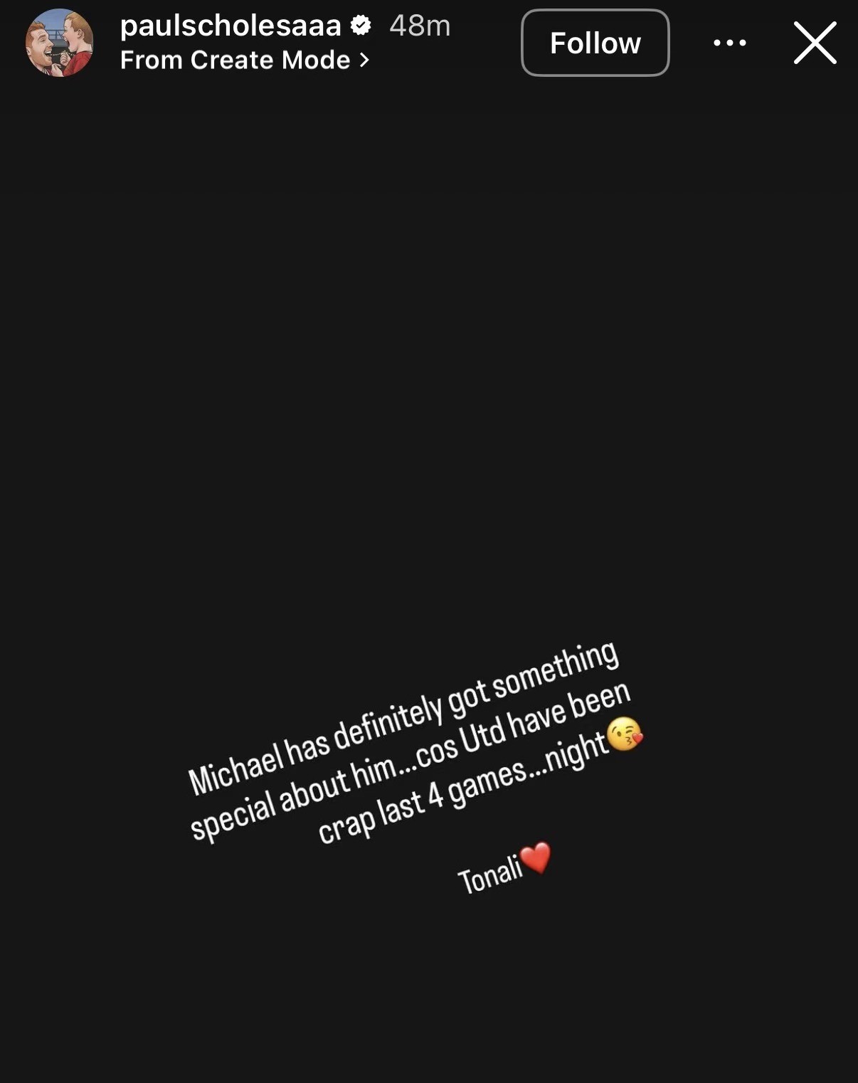 斯科尔斯在社交媒体发表动态,写道:“迈克尔(卡里克)身上肯定有某种特别之处,因为曼联最近四场比赛踢得简直烂透了……晚安😘托纳利❤️”
