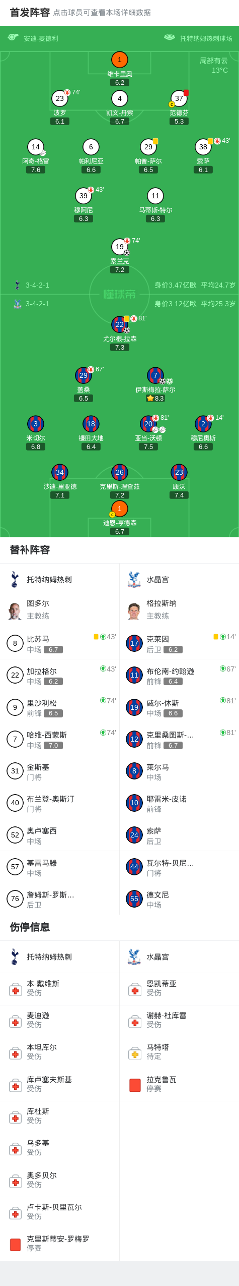 北京时间3月6日英格兰足球顶级联赛 联赛 第29轮,托特纳姆热刺主场对阵水晶宫。上半场,阿奇-格雷助攻索兰克破门。范德芬拉倒萨尔送点并且被直红罚下,萨尔罚入点球扳平比分。沃顿送出两次助攻,拉森和萨尔相继建功。下半场,两队均无建树。全场比赛结束,热刺1-3不敌水晶宫,遭遇各项赛事的5连败和英超连续11轮不胜。