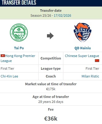 德转显示,中国香港中场颜卓彬从港超大埔加盟青岛海牛的转会费约29万人民币。