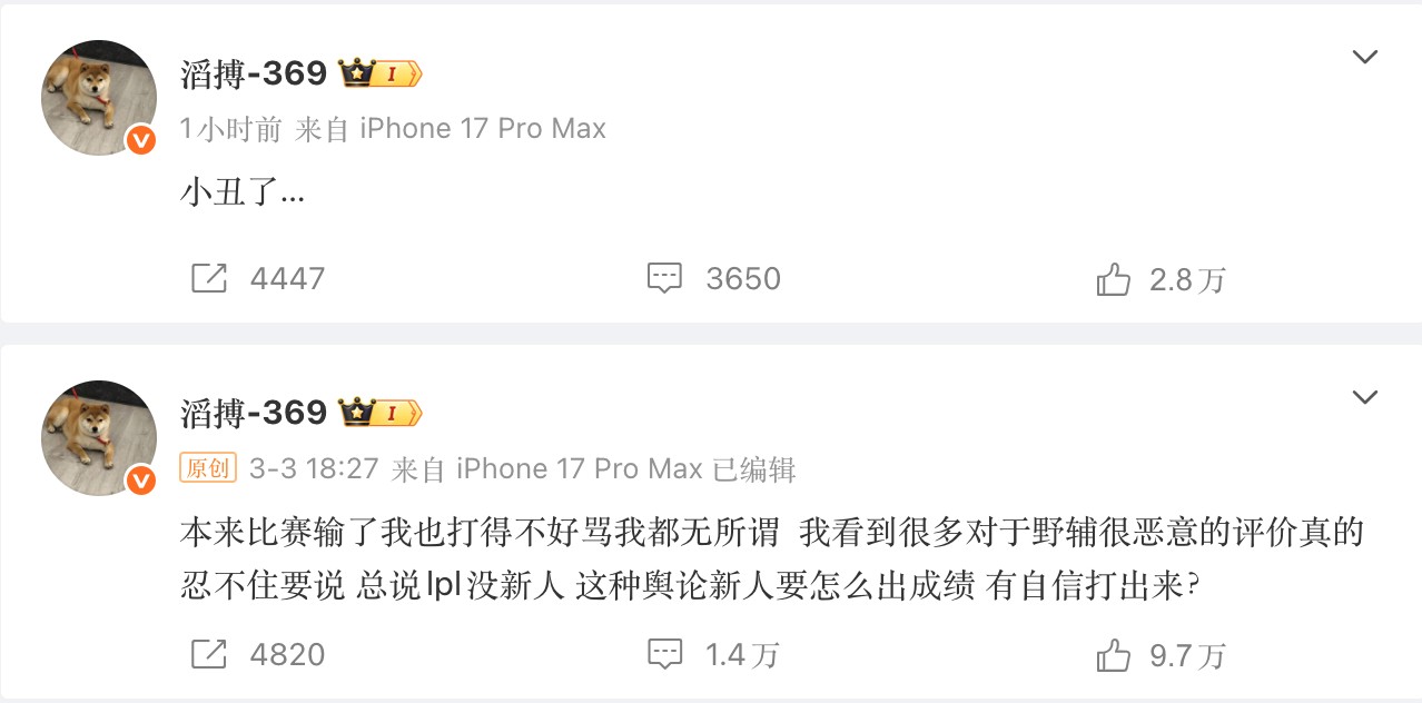 在3月2日TES被WBG淘汰一天后,369发布了一篇微博,力挺队内野辅选手:“本来比赛输了我也打得不好骂我都无所谓 我看到很多对于野辅很恶意的评价真的忍不住要说 总说lpl没新人 这种舆论新人要怎么出成绩 有自信打出来? ”