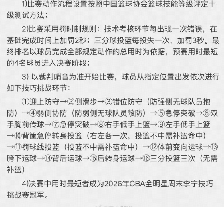 创新这一块,CBA其实一直没落下,刚刚公布的今年全明星技巧挑战赛规则,希望参赛球员能看得懂,总之我是没看懂。不过这也代表了我们正在逐步探索全明星的新玩法,争取让每一届全明星有着不一样的看点。先别说有没有意思,但是节目效果估计肯定少不了。