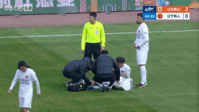 第45分钟,迪力穆拉提右腿不适,接受队医治疗