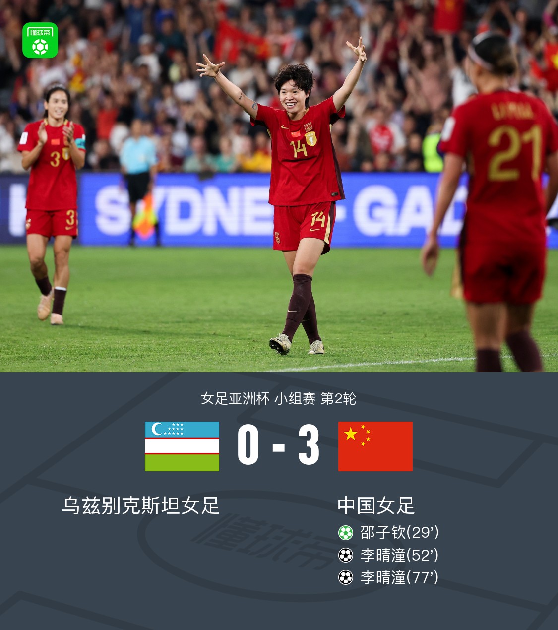 北京时间3月6日女足亚洲杯小组赛第2轮,乌兹别克斯坦女足对阵中国女足。上半场邵子钦造点,并亲自主罚命中。下半场李晴潼弧顶推空门得手,之后张馨传中,李晴潼头球完成梅开二度。最终中国女足3-0战胜乌兹别克斯坦女足提前出线。