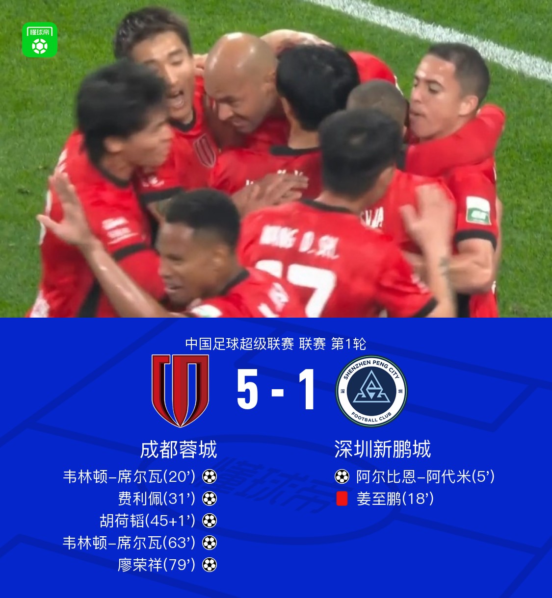 北京时间3月6日中超揭幕战,成都蓉城主场对阵深圳新鹏城。上半场阿代米打入新赛季中超首球,之后姜至鹏被直红罚下,随后韦林顿-席尔瓦扳平比分,费利佩抢点破门反超比分,半场补时阶段胡荷韬抽射破门。下半场韦林顿-席尔瓦完成双响,廖荣祥头球破门。最终成都5-1大胜十人新鹏城。
