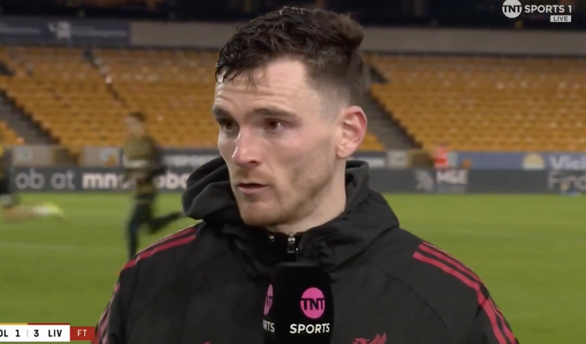 足总杯1/8决赛,利物浦客场3-1击败狼队,此役传射建功的罗伯逊赛后接受了TNT体育的采访。