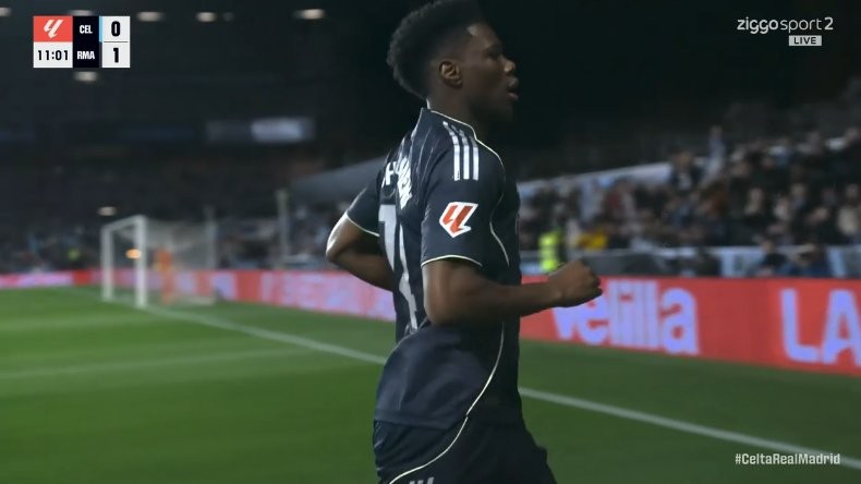 西甲第27轮,皇家马德里客场对阵塞尔塔,上半场楚阿梅尼破门为皇马取得领先,这是楚阿梅尼自2024年4月以来首次在西甲赛场取得进球。